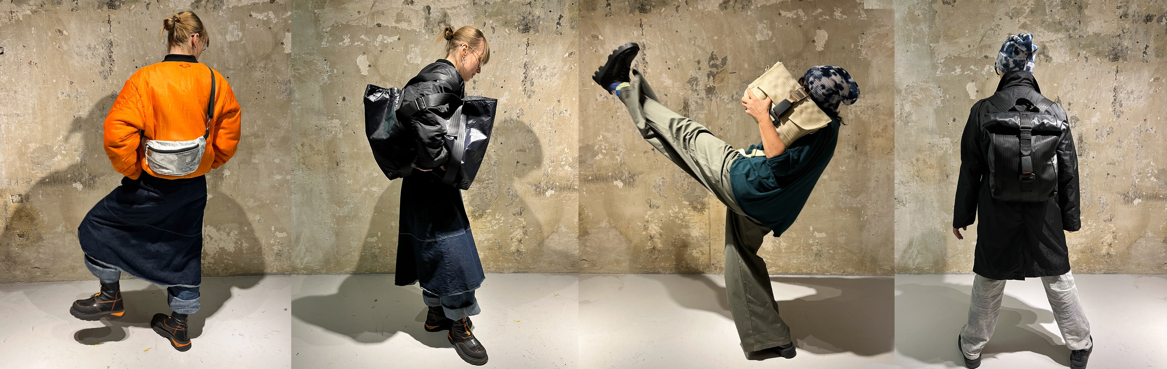 Tworzę krótkie serie torebek ze skrawków materiałów. Szyję torby z pasów samochodowych, torebki z banerów reklamowych, które kiedyś wisiały gdzieś wysoko i opowiadały zupełnie inną historię. Teraz są bliżej ciała. Bliżej codzienności.