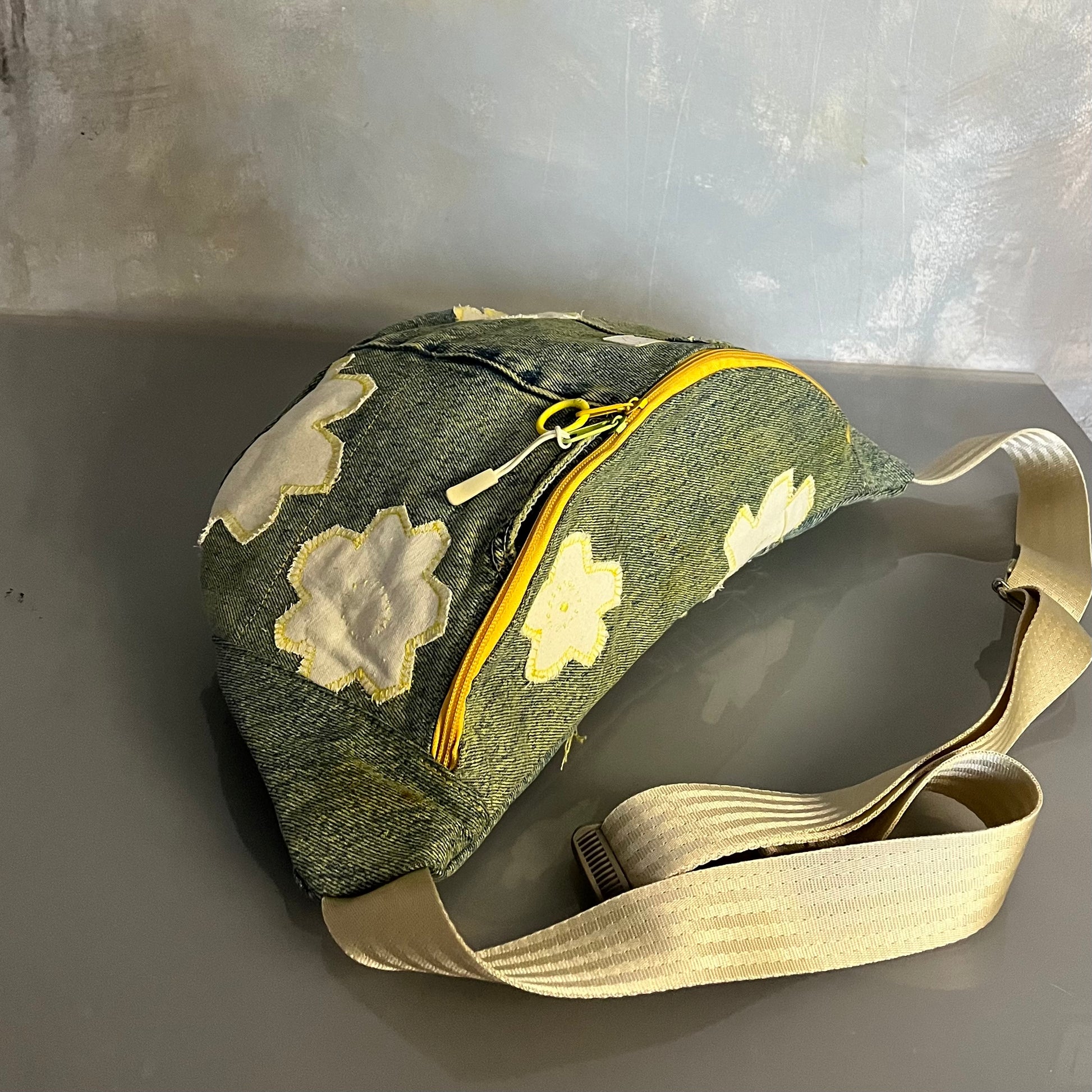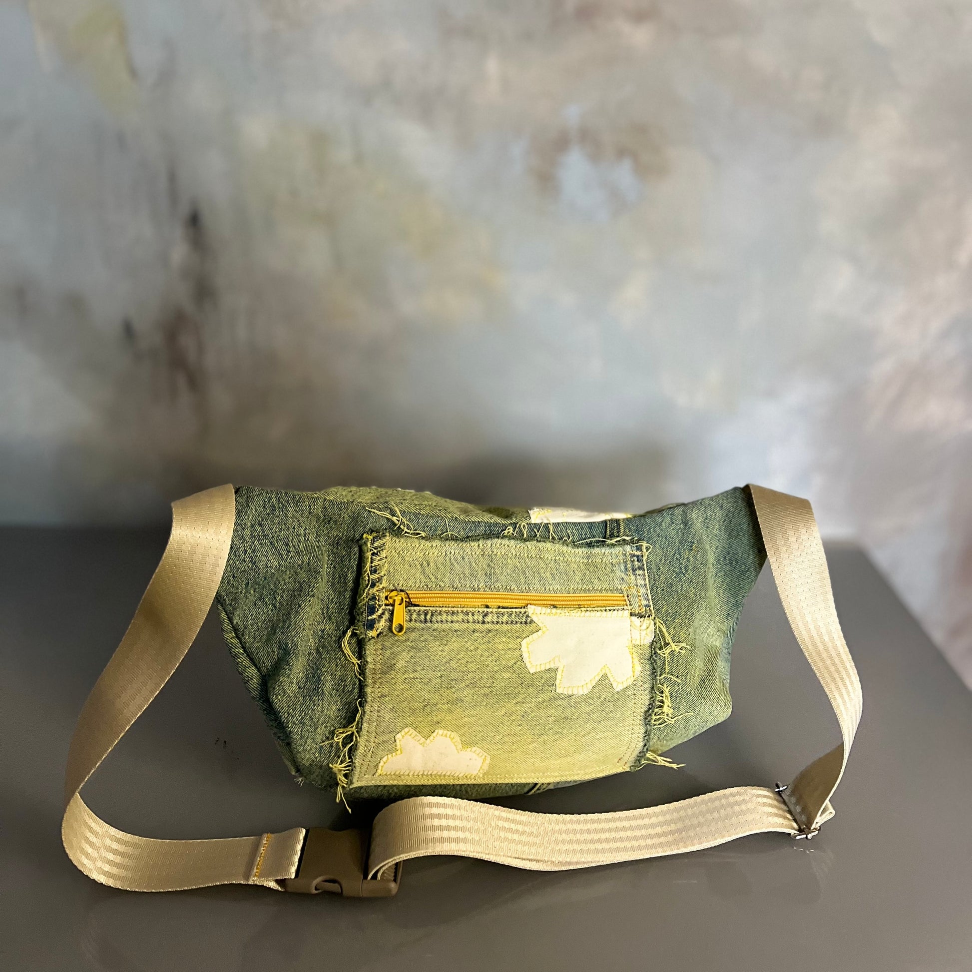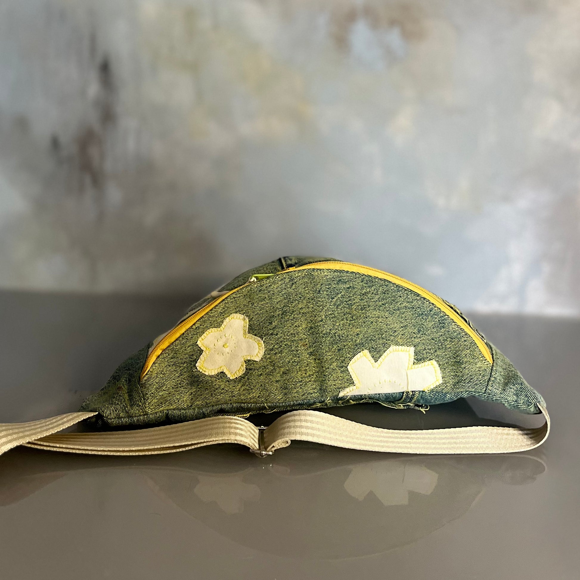 Upcyklingowa, duża nerka. Powstała z czyichś dawnych jeansów – takich, które już coś widziały, coś przeżyły, a teraz dostały nowe życie. Cała uszyta z materiału z second handu, ręcznie barwionego. Ten egzemplarz ma kolor słonecznej zieleni, jak światło przechodzące przez liście w środku dnia. Każda z nich rodzi się w mojej pracowni i żadna nie jest taka sama. To małe, materialne „tylko jedno”.