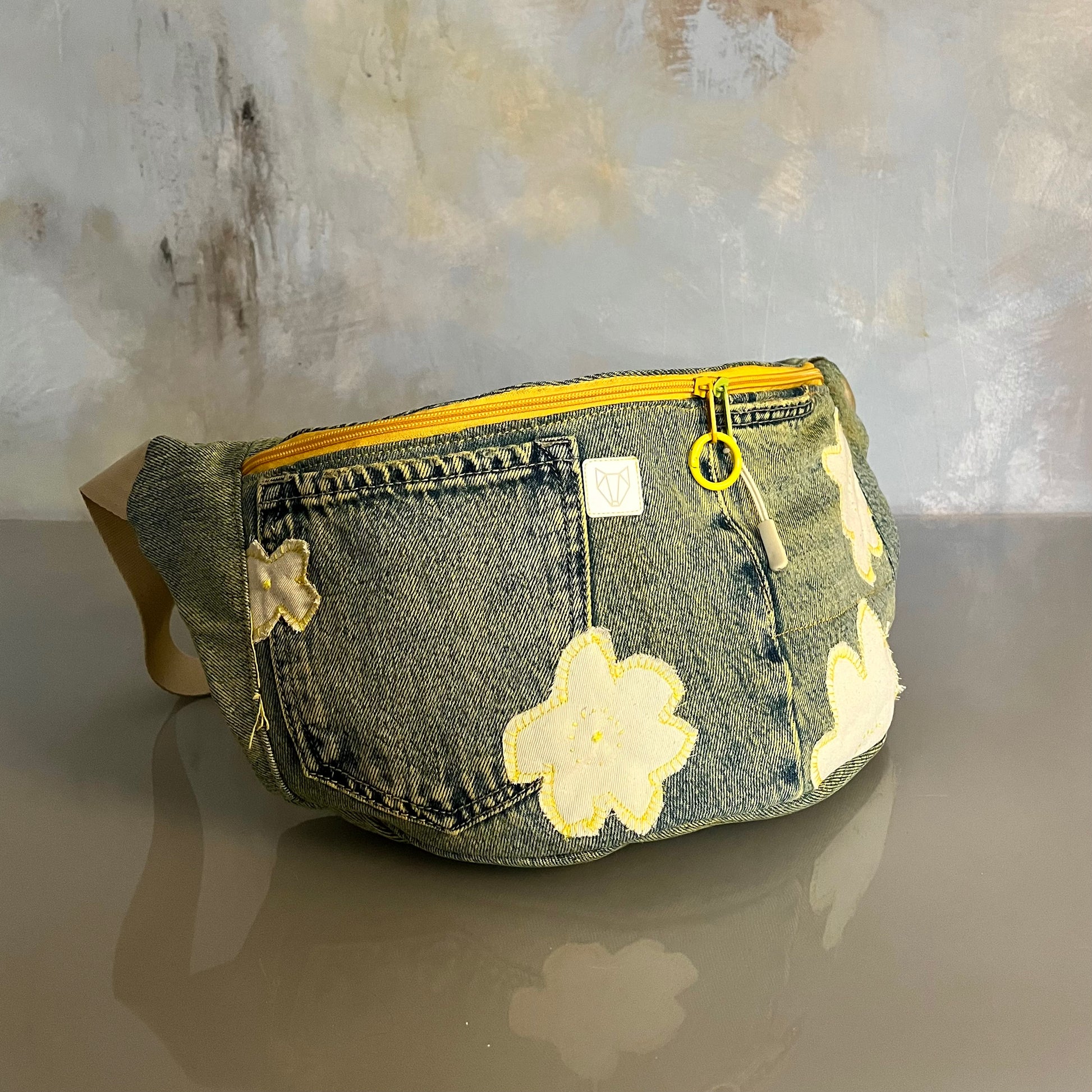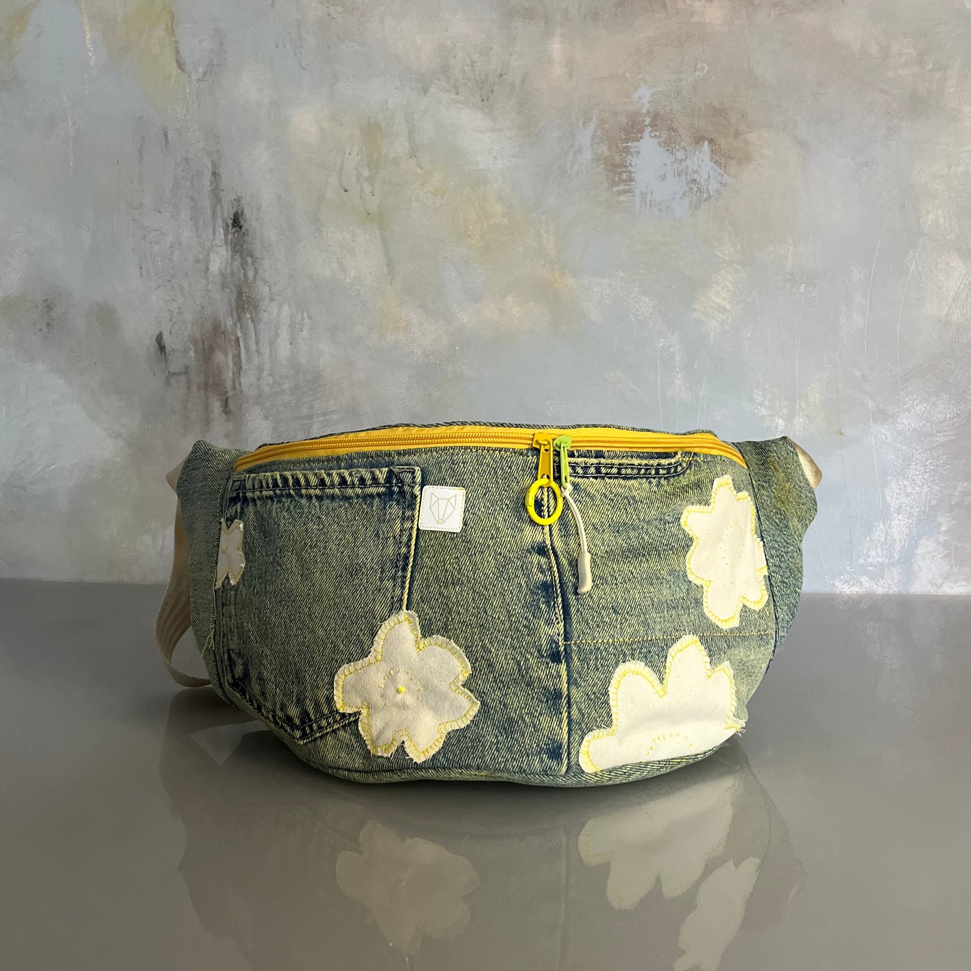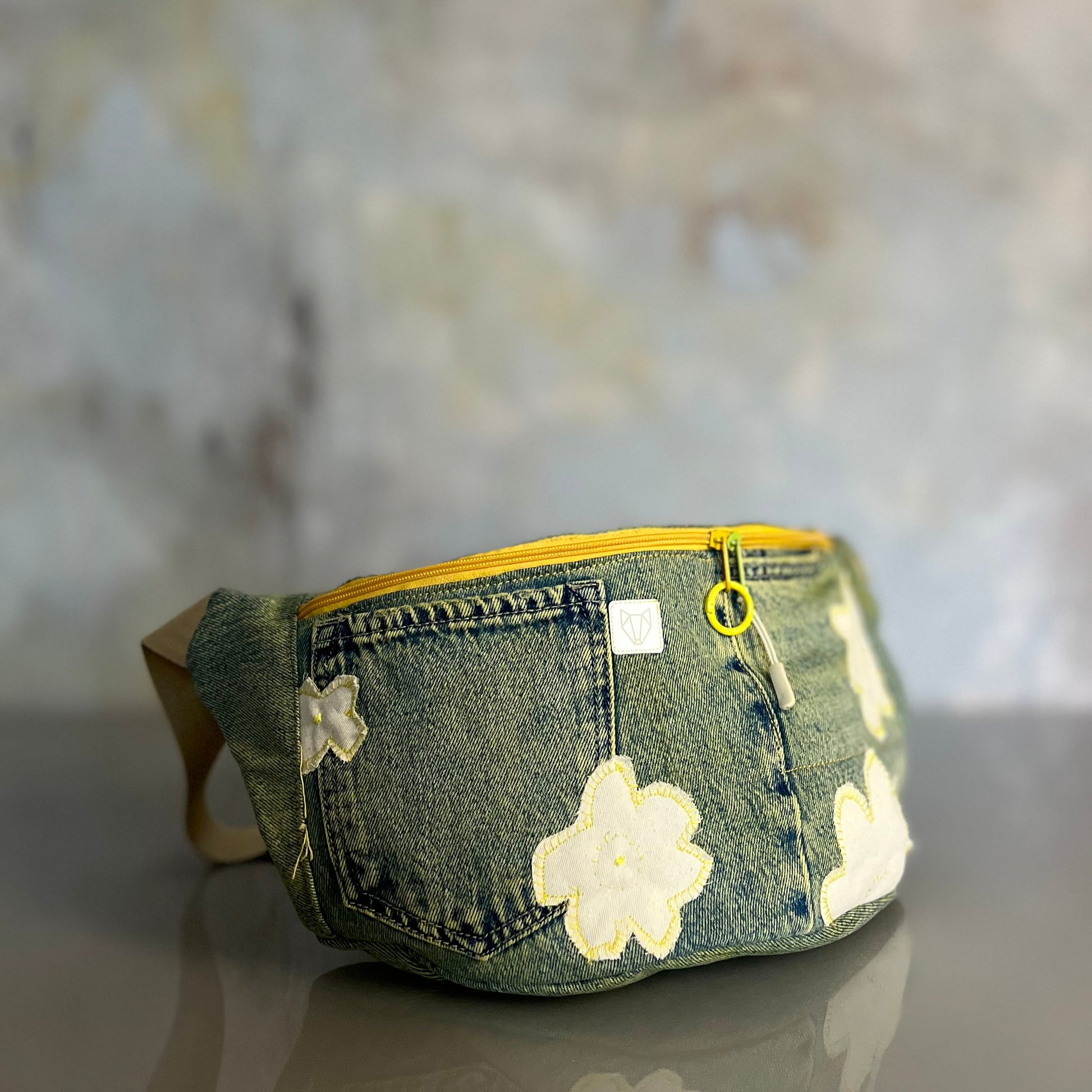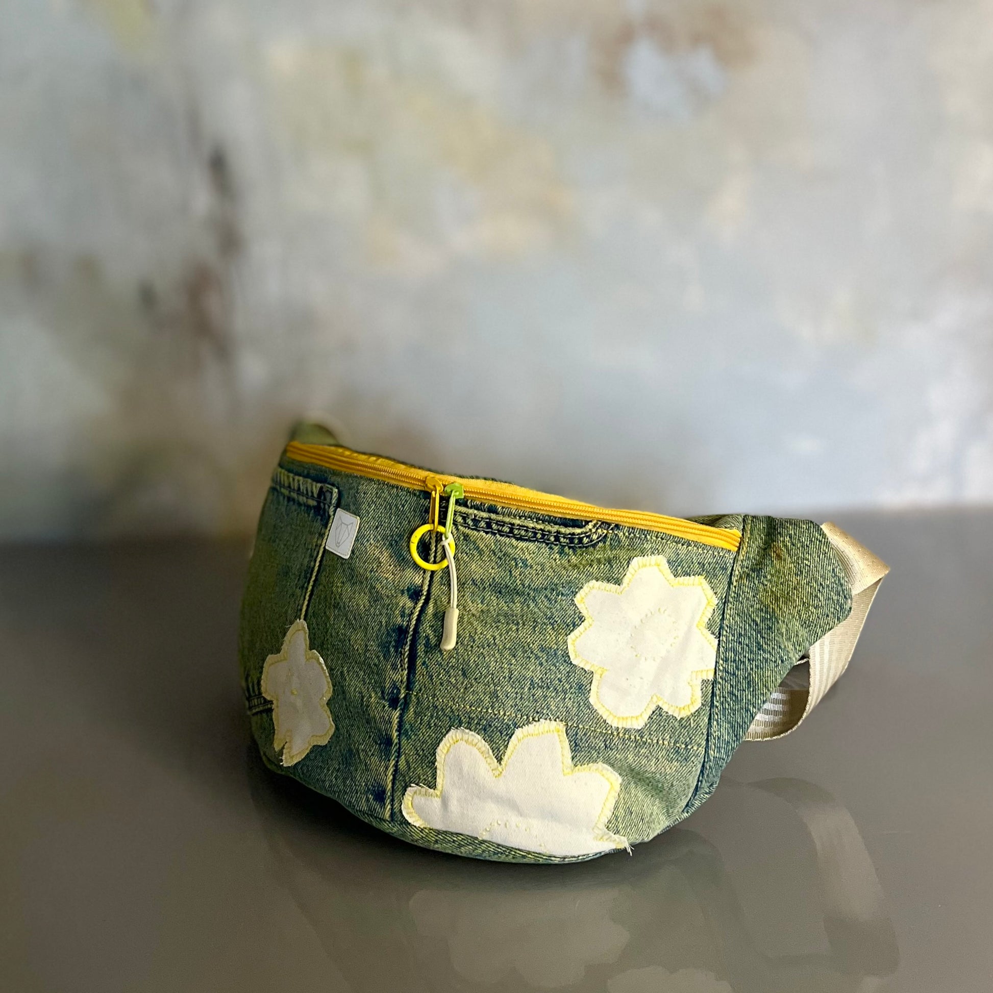 Upcyklingowa, duża nerka. Powstała z czyichś dawnych jeansów – takich, które już coś widziały, coś przeżyły, a teraz dostały nowe życie. Cała uszyta z materiału z second handu, ręcznie barwionego. Ten egzemplarz ma kolor słonecznej zieleni, jak światło przechodzące przez liście w środku dnia. Każda z nich rodzi się w mojej pracowni i żadna nie jest taka sama. To małe, materialne „tylko jedno”.