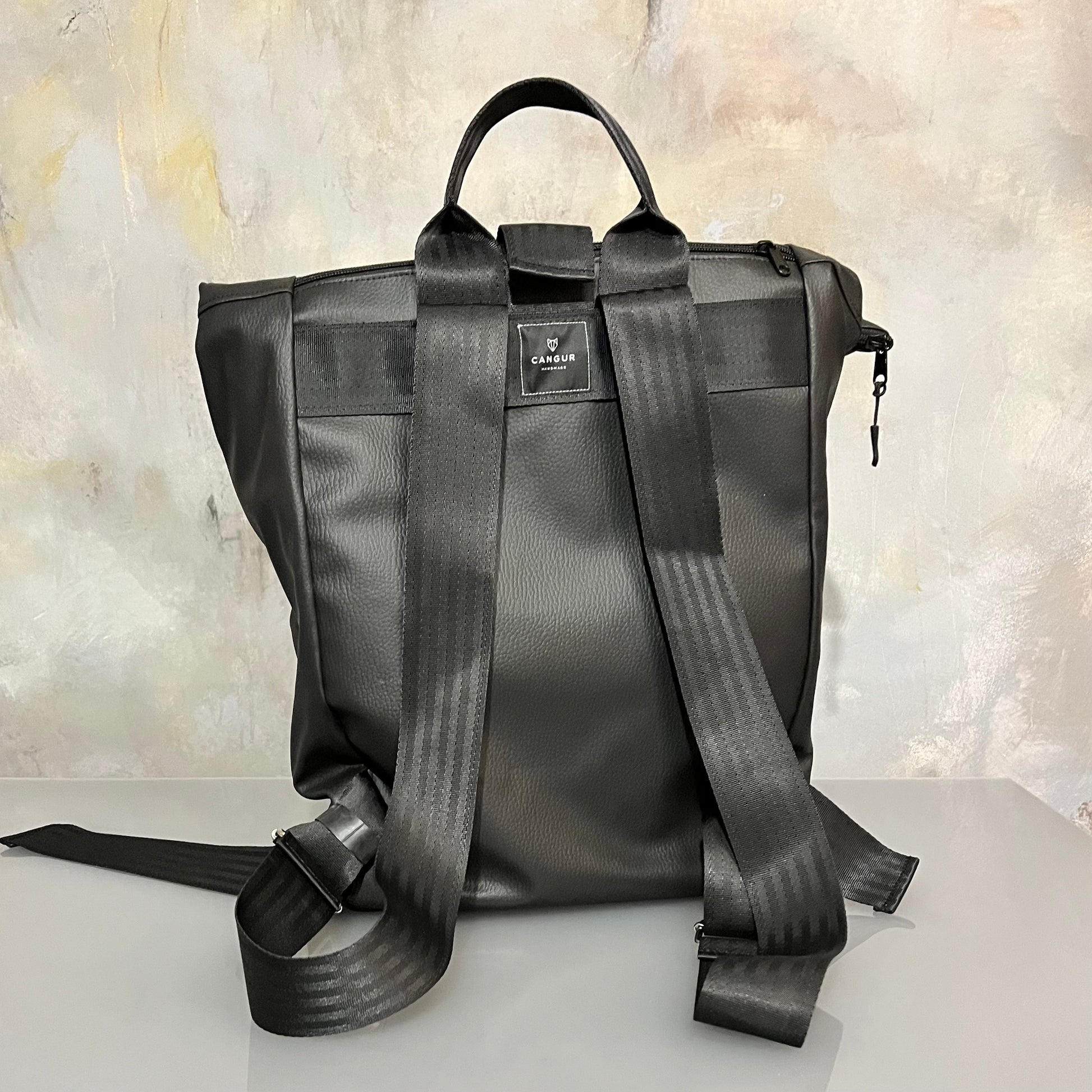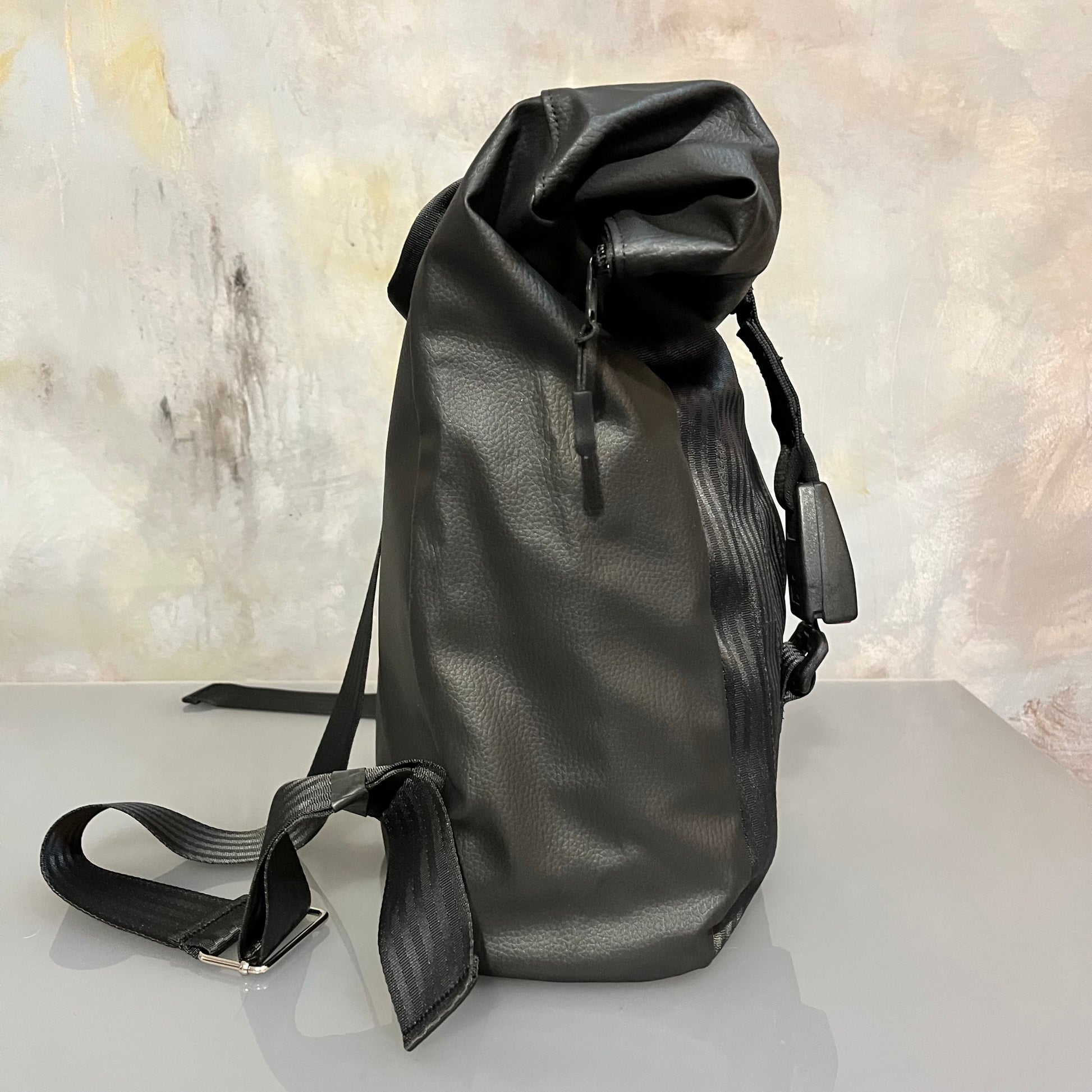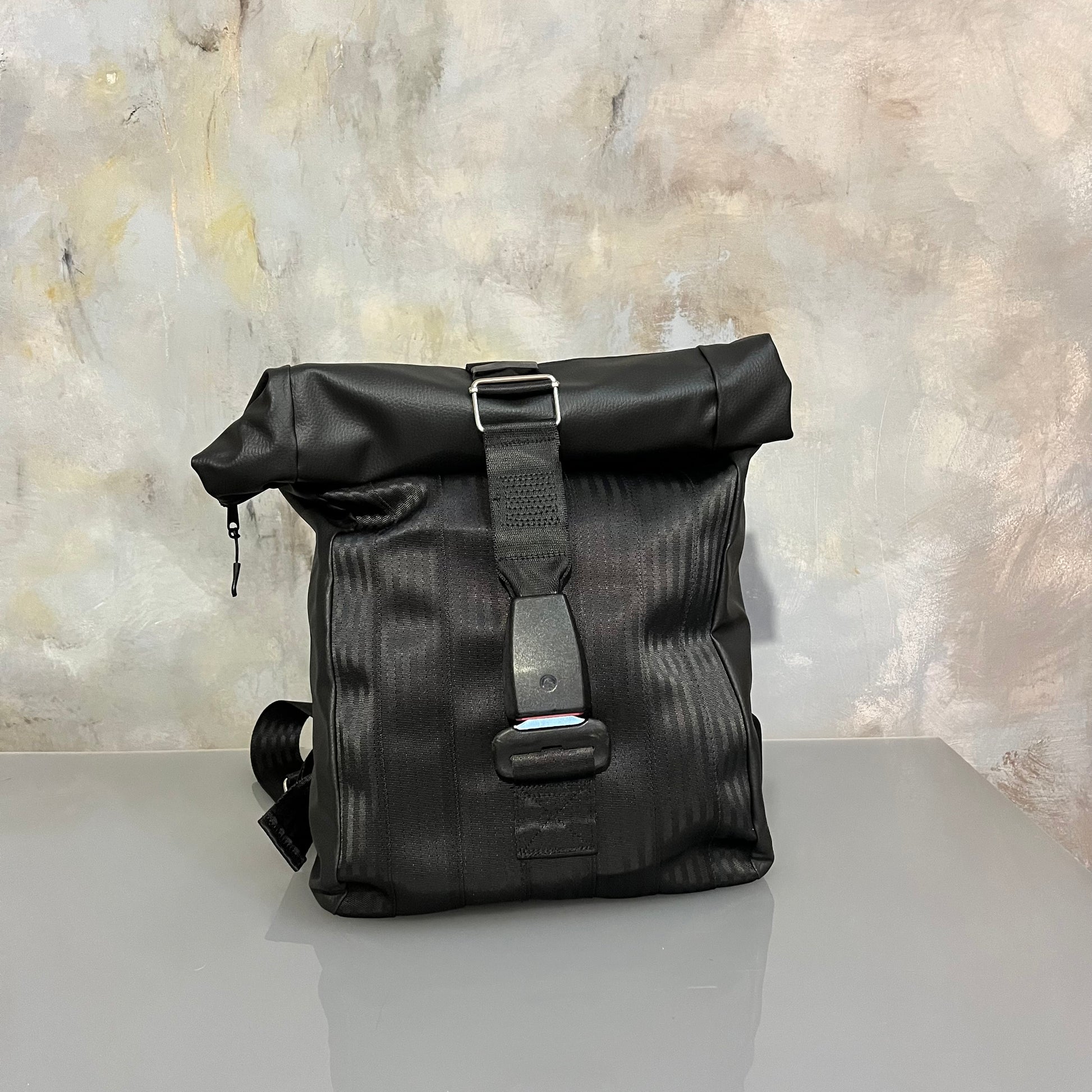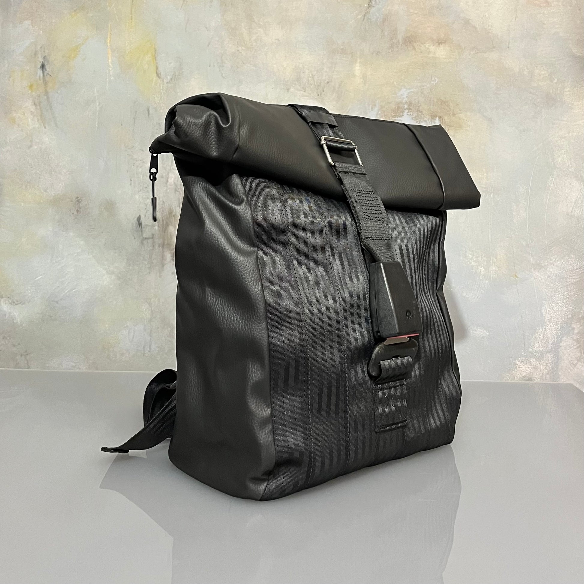 To wyjątkowy, designerski plecak typu roll top, wykonany z odzyskanych pasów bezpieczeństwa i wysokiej jakości ekoskóry.