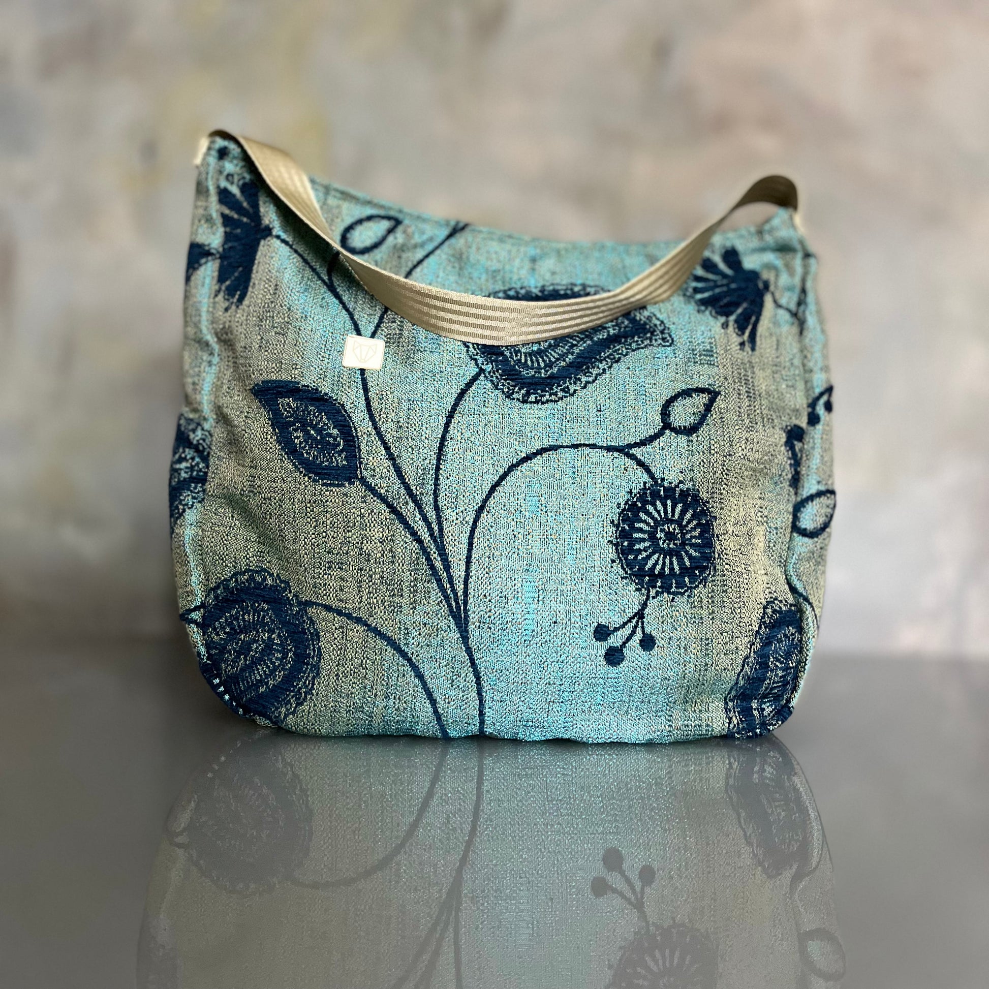 Wykonana z materiału z odzysku. Materiał pochodzi z vintage, żakardowej narzuty w odcieniach błękitu. Pasek wykonany z pasa samochodowego w kolorze beżowym. W środku kieszeń zapinana na zamek.