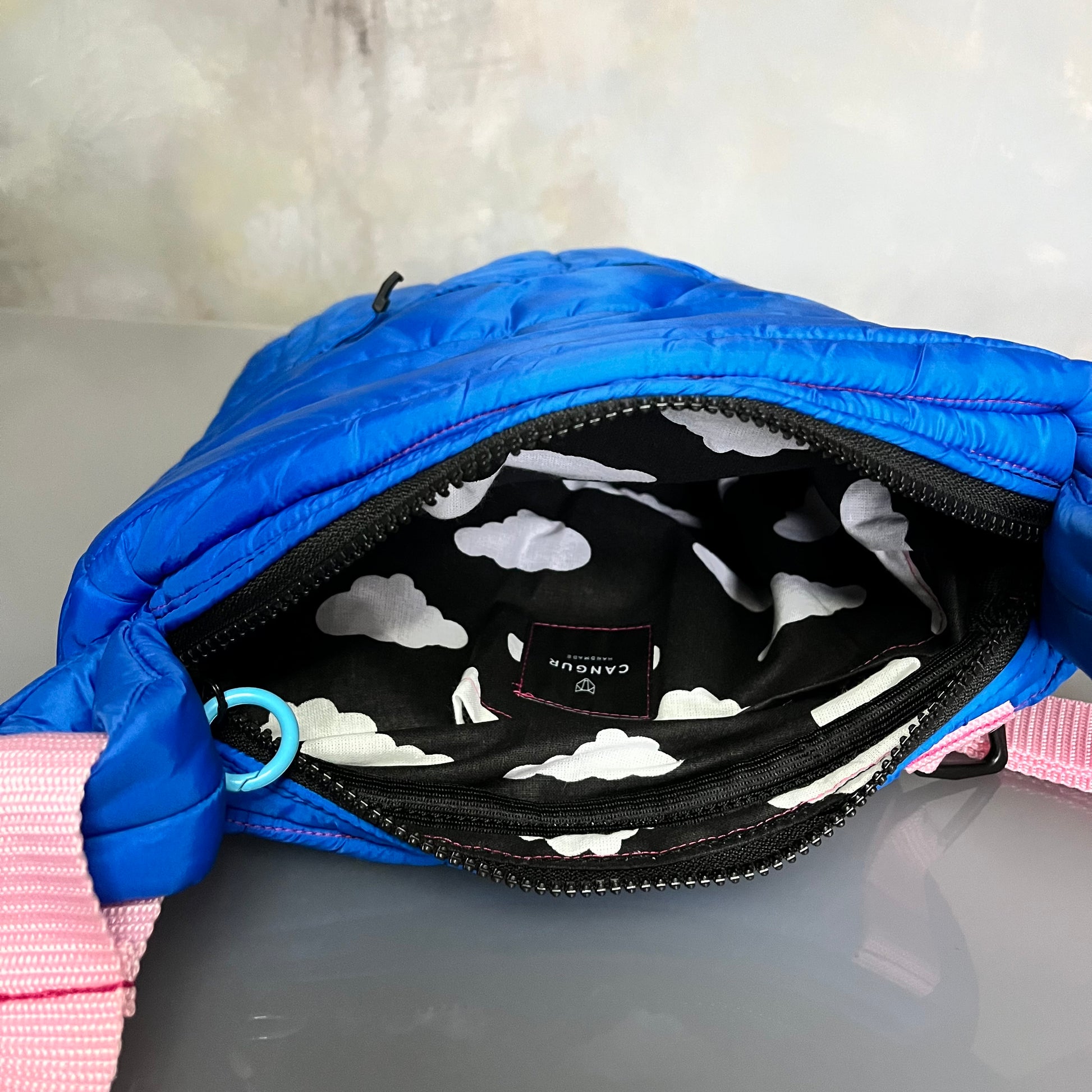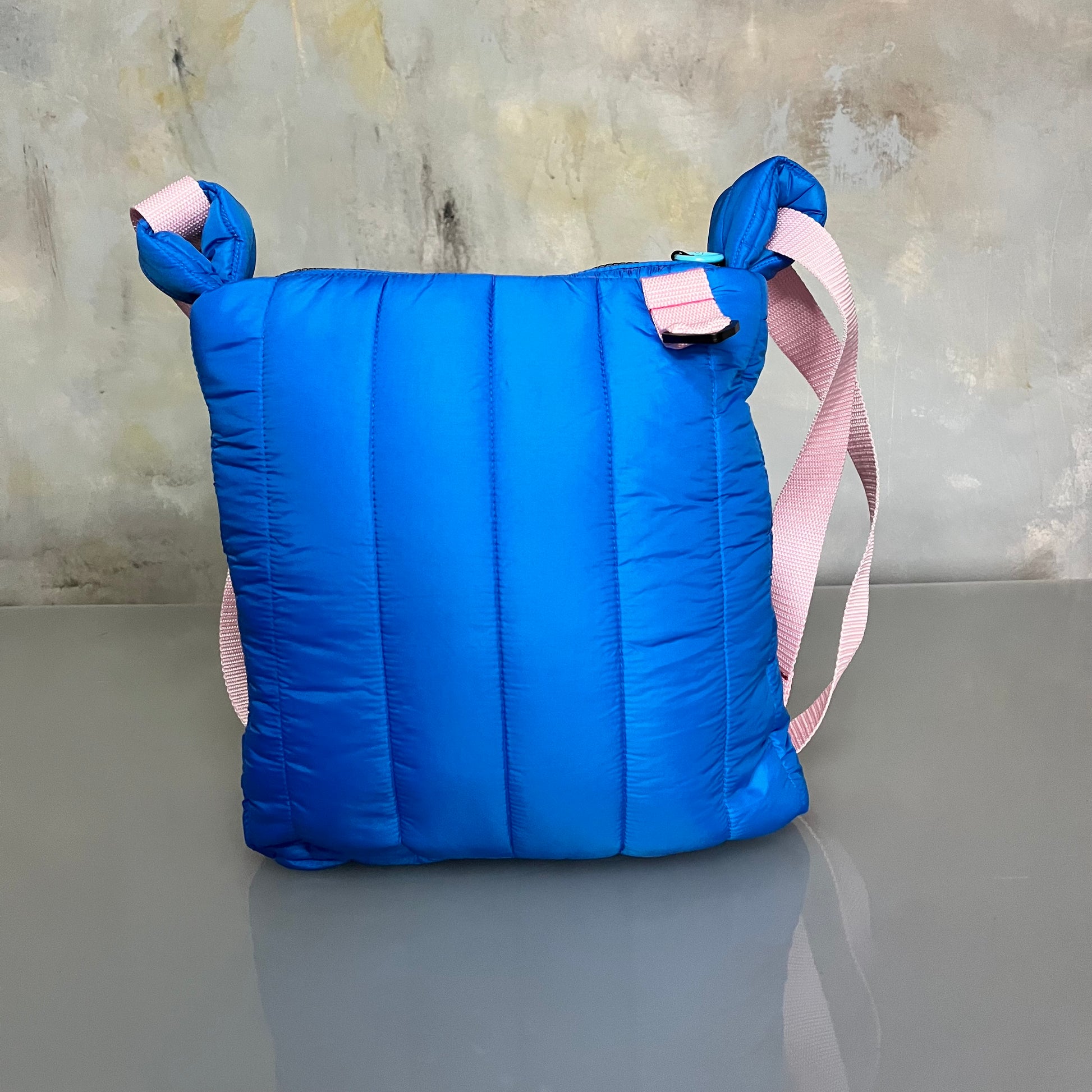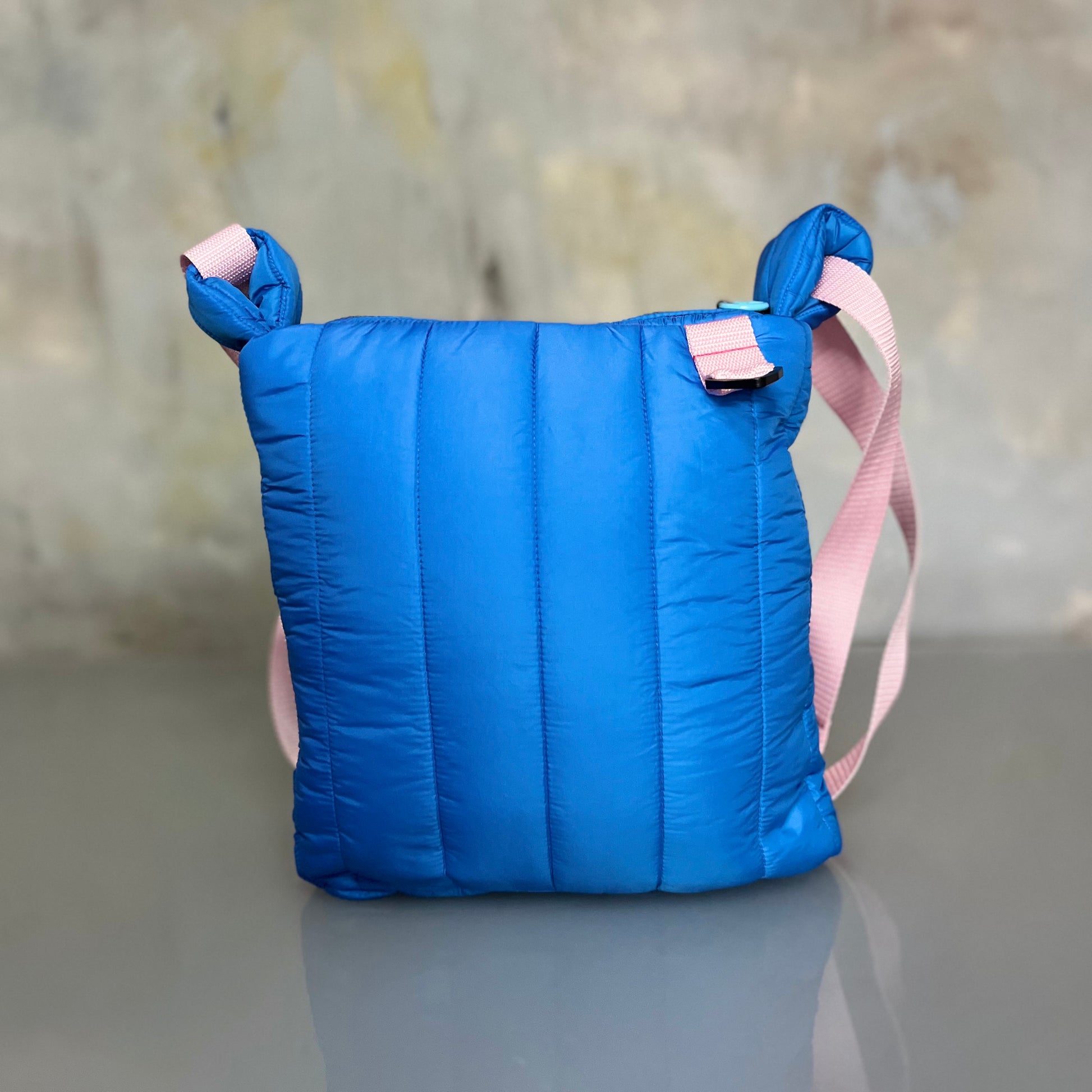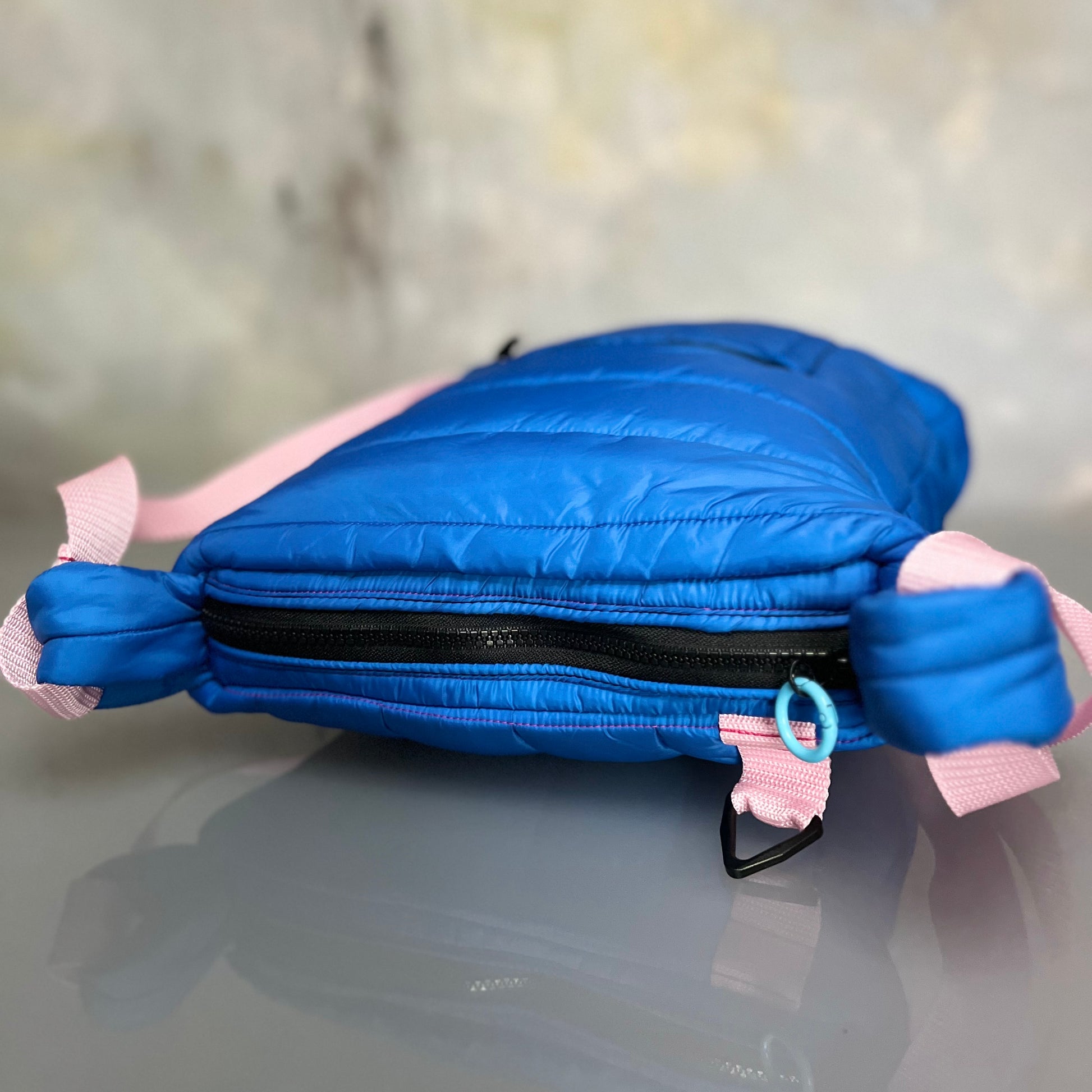 Wykonana z materiału przeznaczonego do recykling. Materiał pochodzi z ocieplanej kurteczki z odzysku. Pasek wykonany z pasa nośnego w kolorze różowym. W środku kieszeń zapinana na zamek. Na zewnątrz kieszonka na zamek.